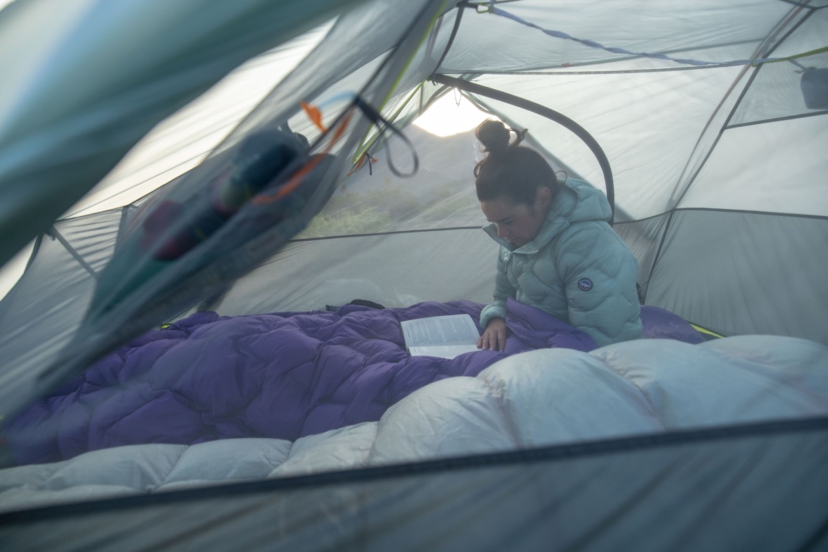 Prut vede u nohou středem, zadní stěna uprostřed je tedy neustále dobře vypnutá, což vytváří více využitelného místa v oblasti nohou a snižuje šanci nalepení footboxu spacáku na vlhké tropiko od kondenzace.