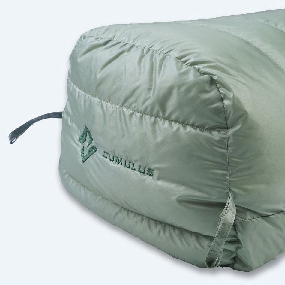 Spacák má 175 cm dlouhý 5 mm YKK zip s rozšířeným jezdcem, aby nedocházelo k jeho zasekávání do látky při zapínání. U nohou pak najdete druhého jezdce, který je ideální pro větrání. Za zipem je na vnitřní straně podélná komora naplněná peřím, která minimalizuje únik tepla přes samotný zip. Dva spacáky Cumulus s opačným zipem (levý + pravý) lze spojit dohromady.