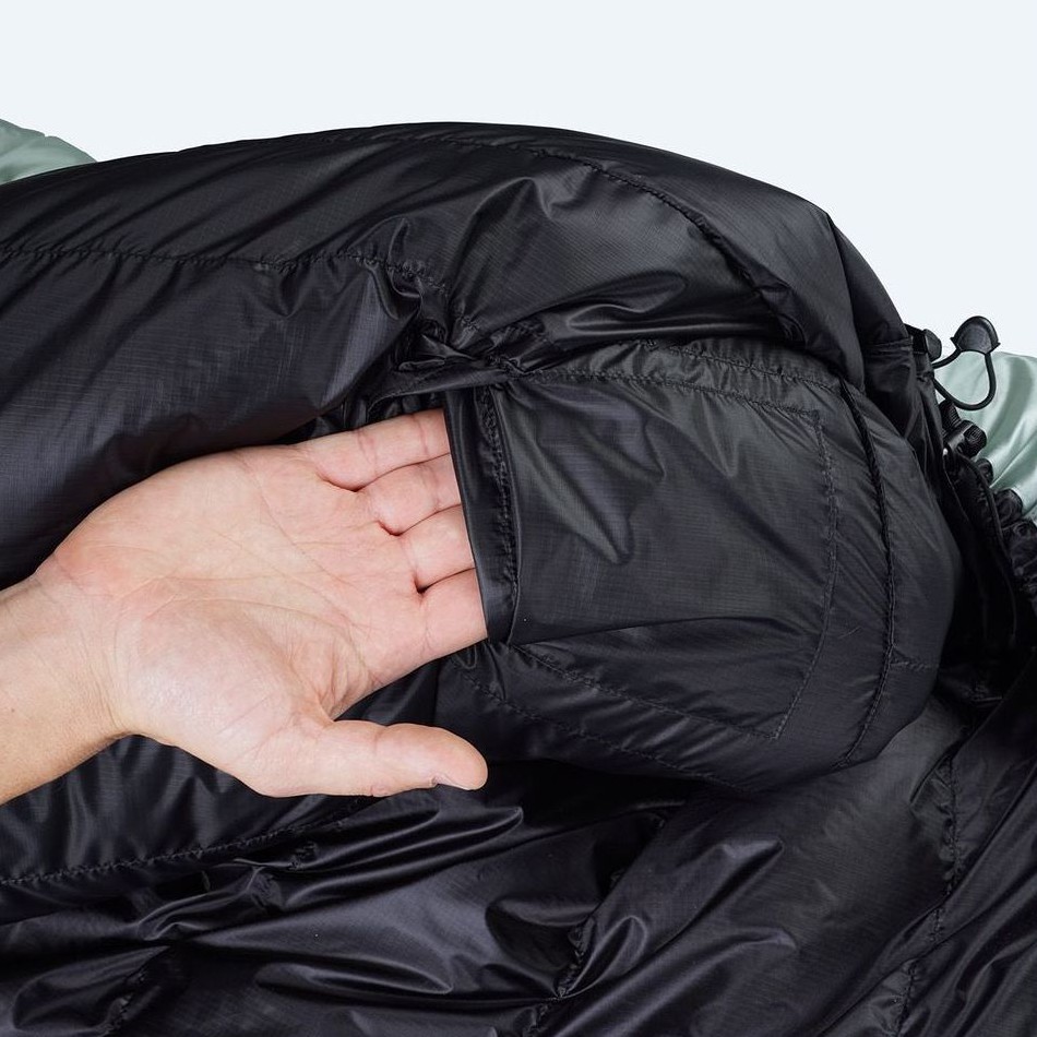 Pro jednoduchou orientaci je stahování kapuce a límce odlišeno, kapuci stahujete plochým popruhem a límec gumičkou. Spacák má samostatný límec naplněný peřím se suchým zipem, který obepne váš krk z obou stran a zabrání únikům tepla přes kapuci. Uvnitř spacáku je síťová kapsa na mobil, špunty do uší či jiné drobnosti.