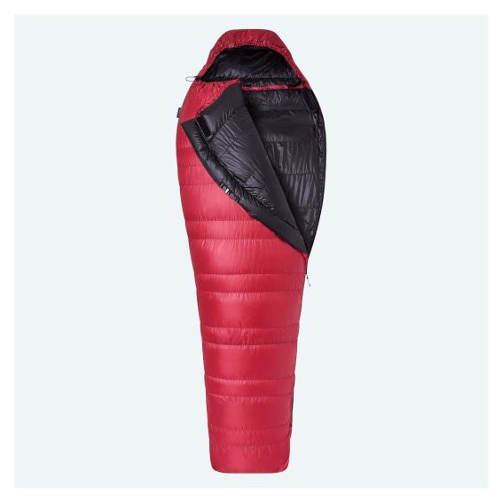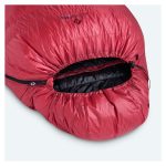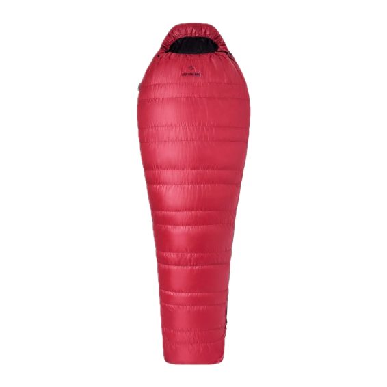 „Teplý třísezónní péřový spacák ve stylové červené barvě.“