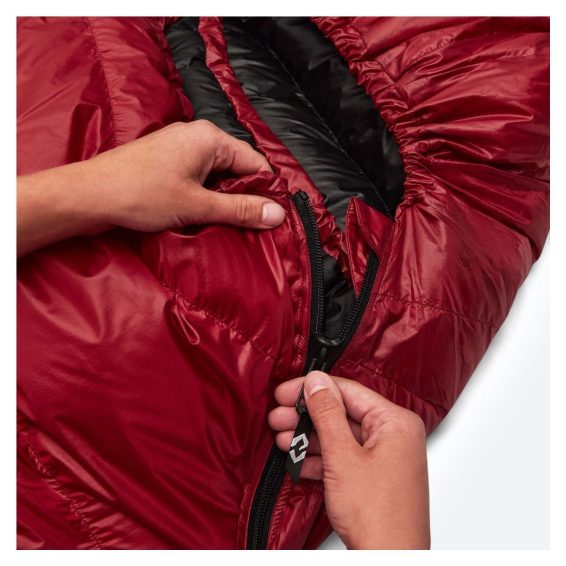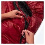 Spacák má 175 cm dlouhý YKK zip s rozšířeným jezdcem, aby nedocházelo k jeho zasekávání do látky při zapínání. U nohou pak najdete druhého jezdce, který je ideální pro větrání. Za zipem je na vnitřní straně podélná komora naplněná peřím, která minimalizuje únik tepla přes samotný zip. Dva spacáky Cumulus s opačným zipem (levý + pravý) lze spojit dohromady.