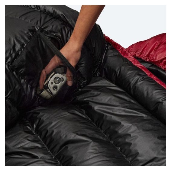 Pro jednoduchou orientaci je stahování kapuce a límce odlišeno, kapuci stahujete plochým popruhem a límec gumičkou. Spacák má samostatný límec naplněný peřím, který obepne váš krk z obou stran a zabrání únikům tepla přes kapuci. Uvnitř spacáku je síťová kapsa na mobil, špunty do uší či jiné drobnosti.