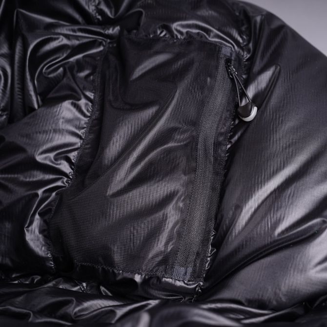 Pro jednoduchou orientaci je stahování kapuce a límce odlišeno, kapuci stahujete plochým popruhem a límec gumičkou. Spacák má naducaný límec s peřím, který obepne váš krk z obou stran a zabrání únikům tepla přes kapuci. Uvnitř spacáku je síťová kapsa na mobil, špunty do uší či jiné drobnosti.
