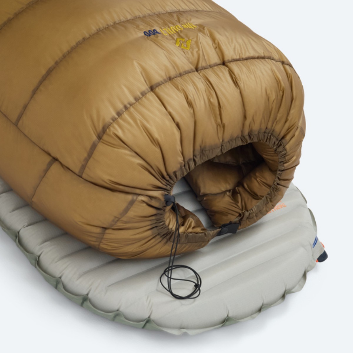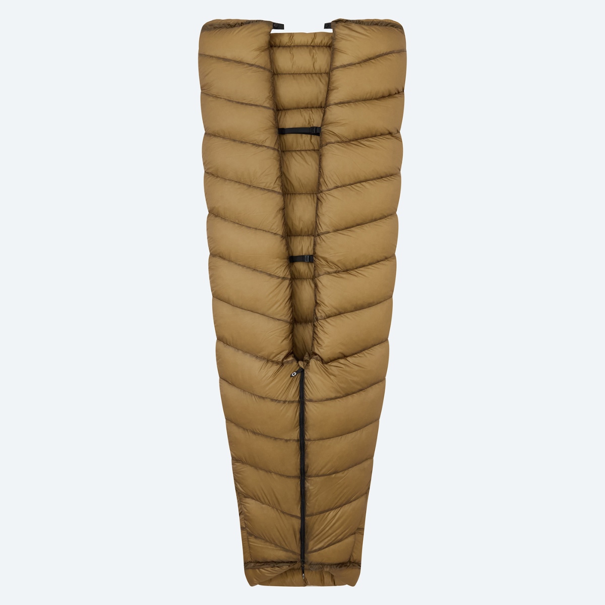 Stahování spodního okraje a zip o délce 70 cm ve spodní části umožňují uzavřít footbox pro lepší tepelný komfort během chladnějších nocí, nebo jej rozepnout pro zvýšení ventilace při vyšších teplotách. Plným rozepnutím zipu proměníš quilt v klasickou péřovou deku. Aby neunikalo teplo kolem zipu, jsou podél něj umístěny speciálně navržené péřové komory.