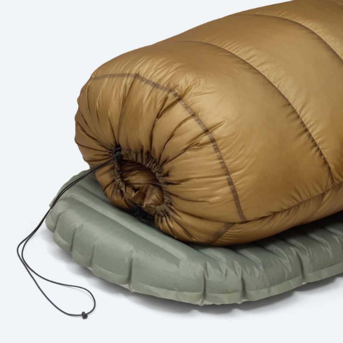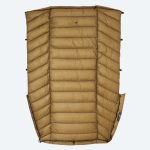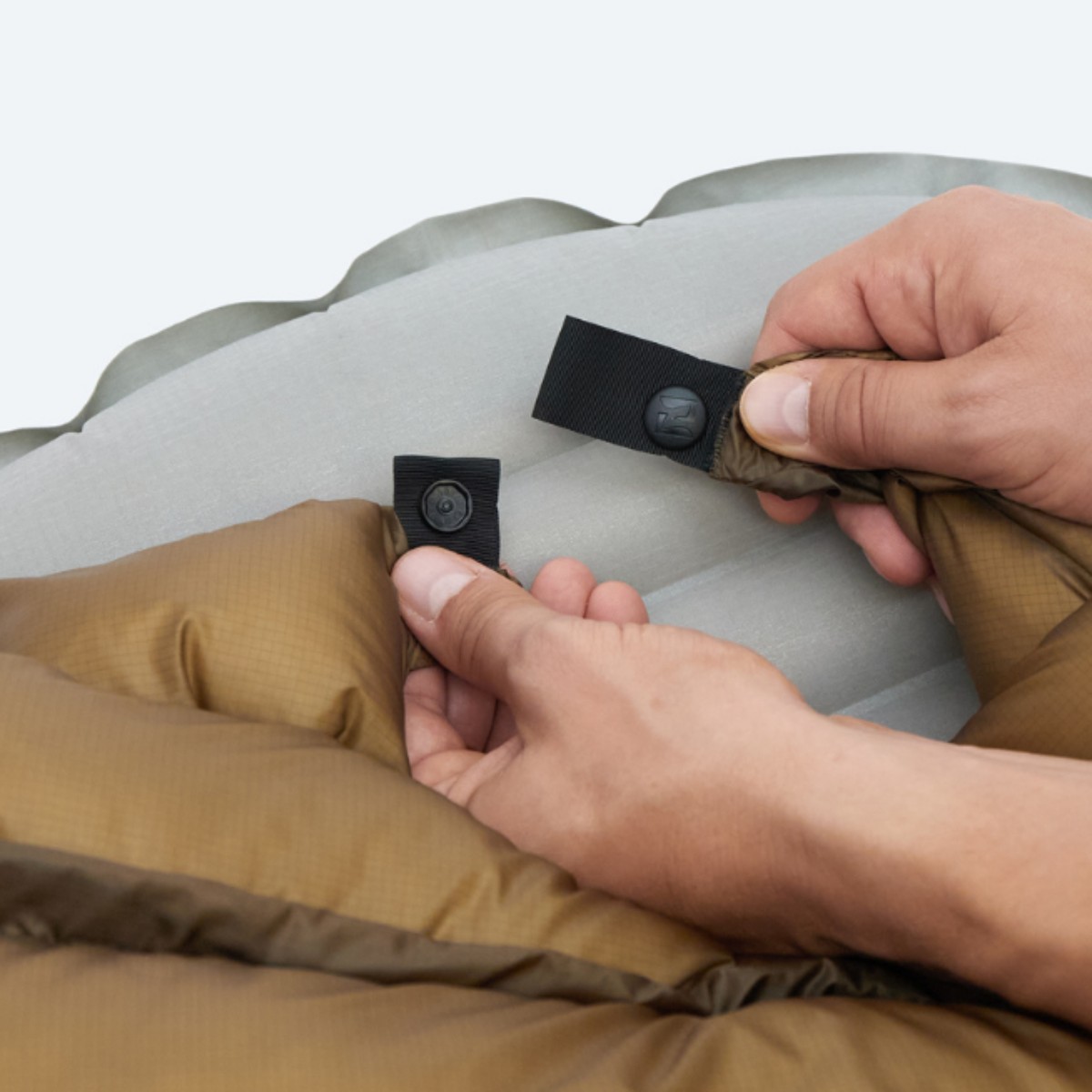 O izolaci od země se stará karimatka. Aby otvor na zádech zůstal po celou dobu pod tebou, připevňuje se quilt ke karimatce pomocí elastických popruhů. Quilt zůstává celou dobu v základní poloze a ty se otáčíš v něm. Quilt lze používat s jakýmkoliv typem karimatky (nafukovací, pěnová). Quilt zároveň nemá kapuci, tu ale můžeš jednoduše nahradit čepicí nebo péřovkou/mikinou s kapucí.