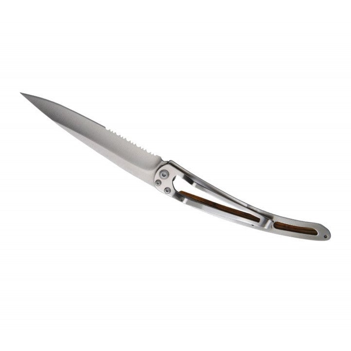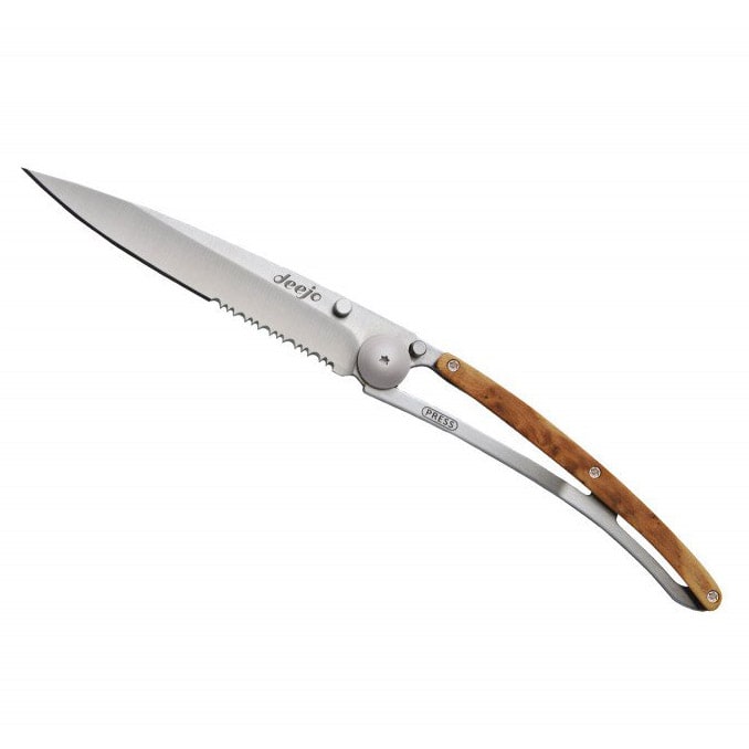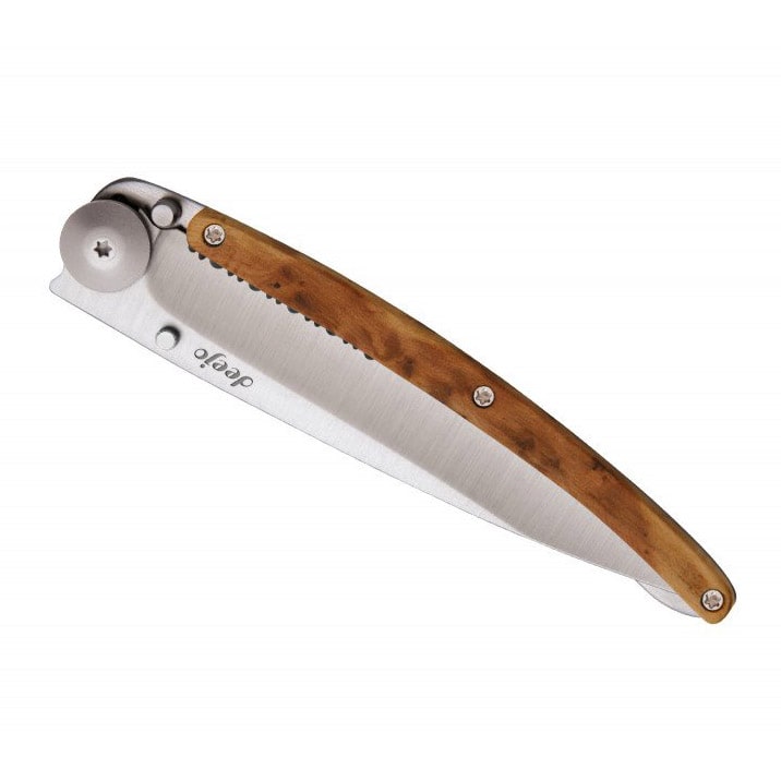 Rukojeť je zde opatřena střenkou z kořene exotického jalovce. Zubaté ostří je vhodnější pro řezání lan a provazů. Spolehlivá pojistka zajišťuje, že se nůž v otevřené poloze při manipulaci neuzavře. Pomocí spony na zadní straně nože můžete nůž připevnit k opasku nebo třeba ramennímu popruhu batohu a mít ho vždy po ruce. Největší verze 37 g je perfektní volbou pro ty, co na svých cestách vyžadují maximální komfort při krájení. Nůž je dodáván ve vzhledné krabičce, takže je ideální i jako dárek.