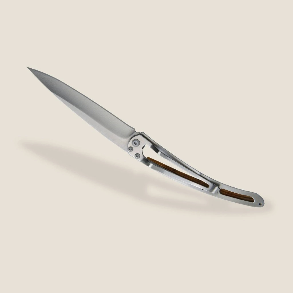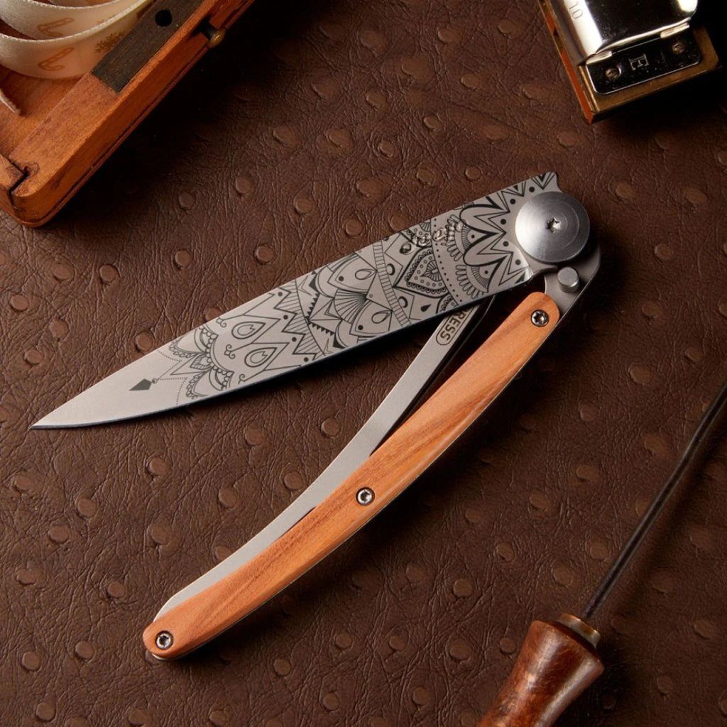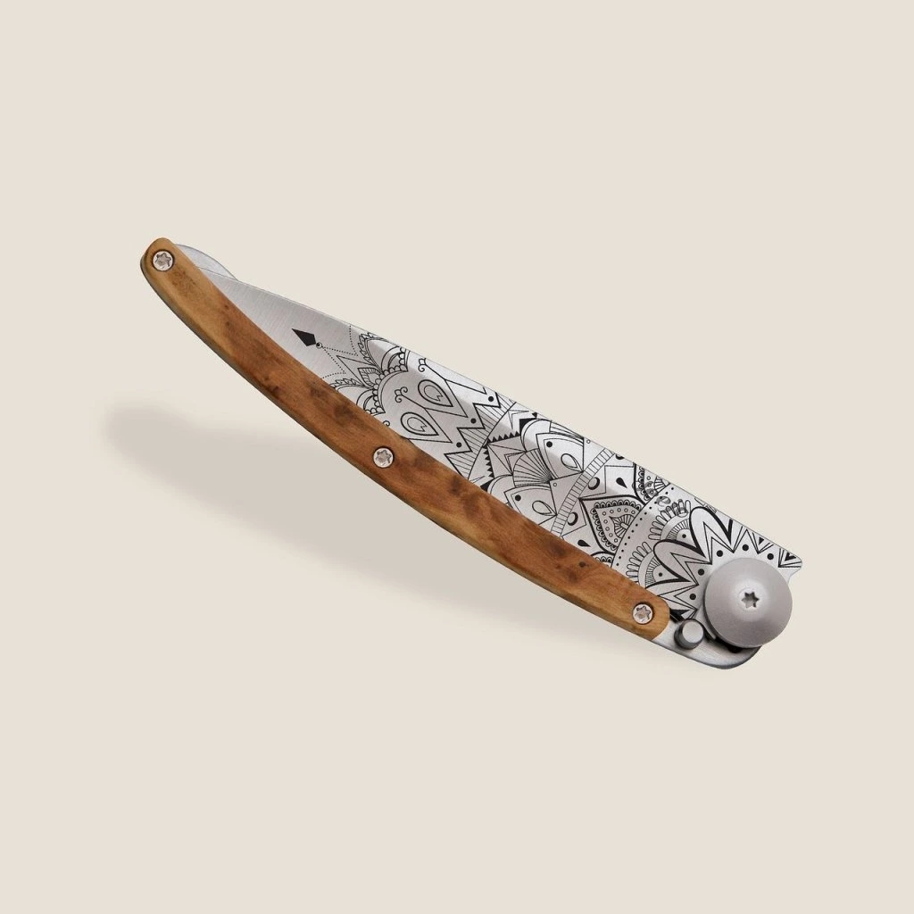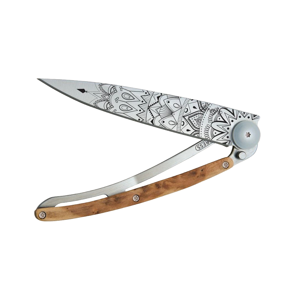 Rukojeť je zde opatřena střenkou z jalovcového dřeva. Díky tetovanému motivu mandaly se zde skutečně naplní to, co značka Deejo nese ve svém sloganu – ”Nůž, který se ti podobá.” Spolehlivá pojistka zajišťuje, že se nůž v otevřené poloze při manipulaci neuzavře. Pomocí spony na zadní straně nože můžeš nůž připevnit k opasku nebo třeba ramennímu popruhu batohu a mít ho vždy po ruce. Největší verze 37 g je perfektní volbou pro ty, co na svých cestách vyžadují maximální komfort při krájení. Nůž je dodáván ve vzhledné krabičce, takže je ideální i jako dárek.