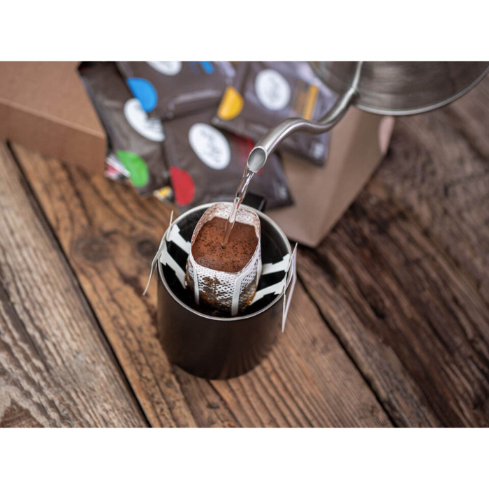 Výběrová káva (10 g) začerstva namletá do šikovného filtru a balená do sáčku s dusíkem.