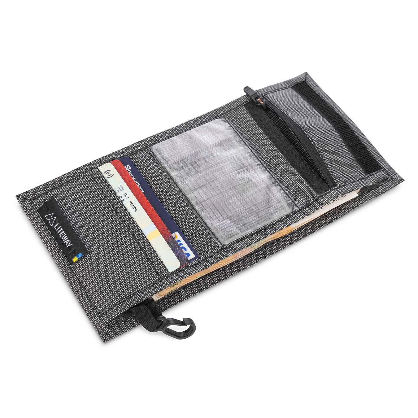 Kombinace přihrádek umožňuje pohodlné a kompaktní uložení bankovních karet, dokladů, hotovosti a mincí. Slot na hotovost má klopu z poloprůhledného DCF pro dodatečnou fixaci nebo oddělení bankovek. Uzavření peněženky je řešeno suchým zipem. Uvnitř se nachází karabina, která umožňuje připnout peněženku k batohu nebo připevnit klíče.