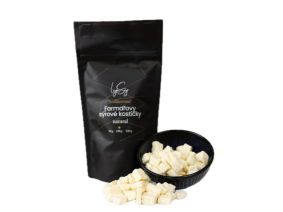 „Poctivý, mrazem sušený sýr ve formě malých křupavých kostiček – různé příchutě.“