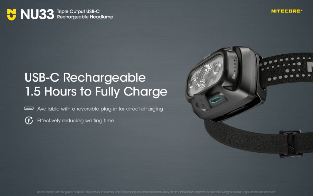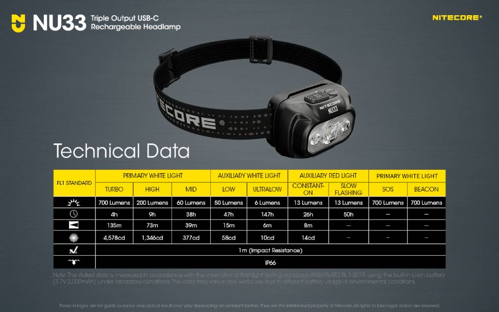 Nitecore NU33 je lehká, výkonná čelovka, která s celkovou hmotností 95,5 gramů nabízí výkon 700 lm a dosvitem až 135 m. Čelovka je vybavena nabíjecím Li-Ion akumulátorem o kapacitě 2 000 mAh, který vydrží svítit na jedno nabití na nejúspornější režim až 147 hodin.