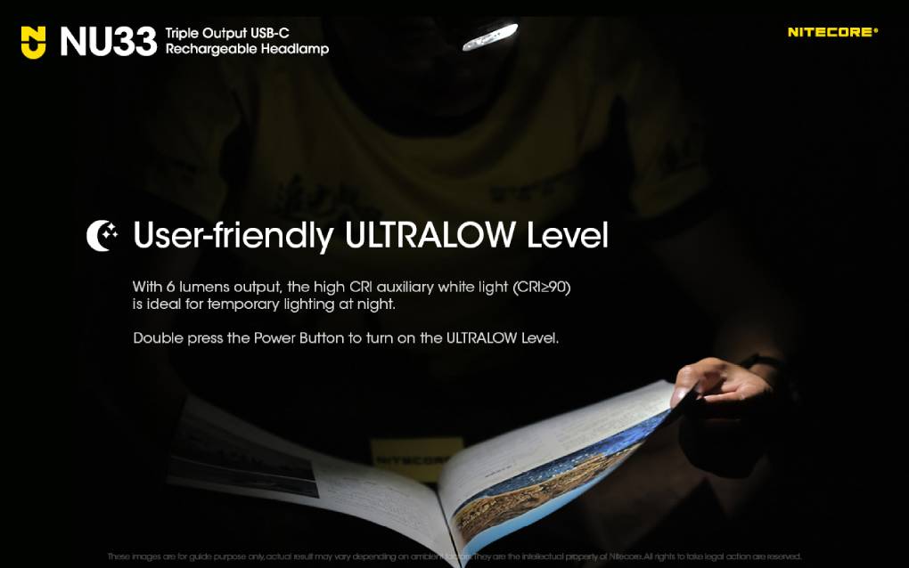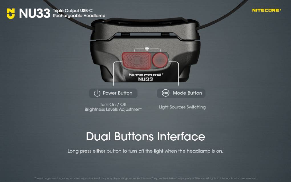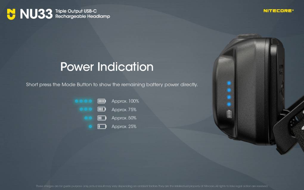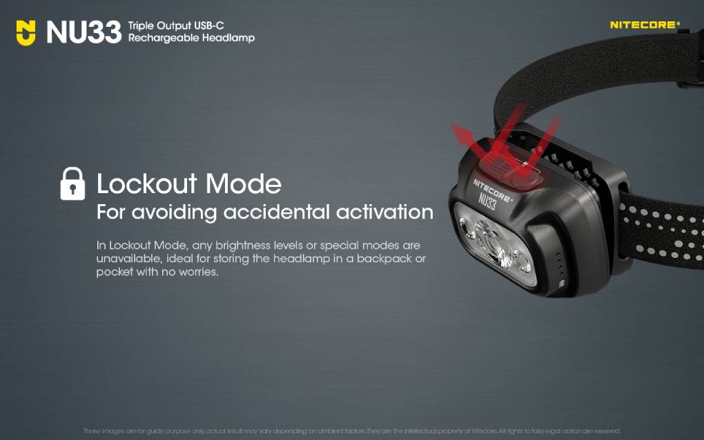 Nitecore NU33 nabízí 3 intenzity svícení hlavního světla, 2 intenzity sekundárního CRI a 2 režimy pro červené světlo. Čelovka umí také SOS signalizaci a rychlé problikávání (maják).