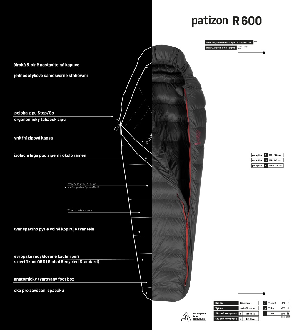 Spacáky ze série R od české značky Patizon jsou maximálně šetrné k přírodě, nabízí pohodlný střih a spoustu technických vychytávek a promyšlených detailů. Ideálně kombinují poměr cena/výkon. Spacák R600 je se svou hmotností pod 1 kg ideální na výlety a treky od jara až do podzimu. Je skladný, ale zároveň i prostorný a pohodlný.