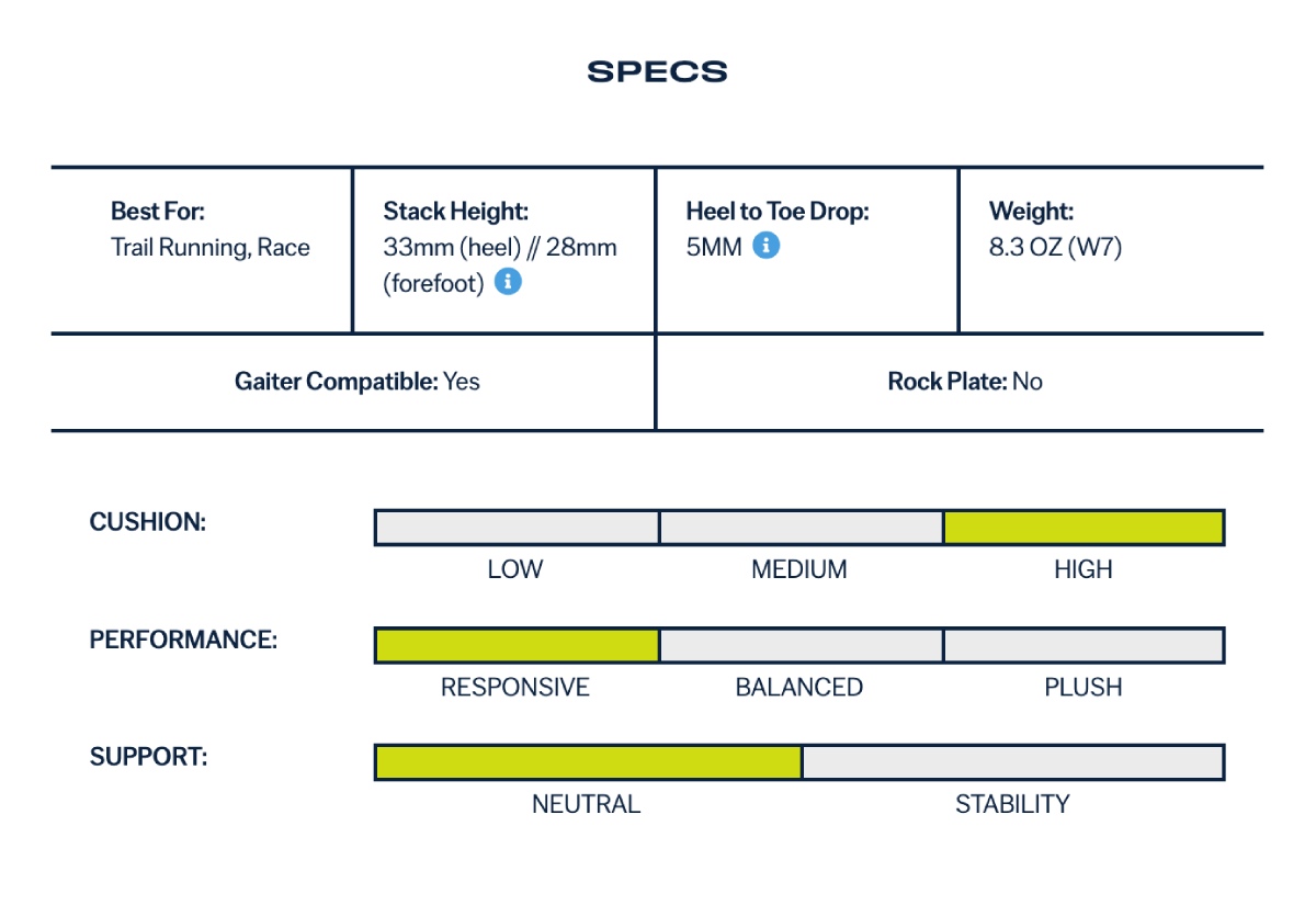 Boty MTN Racer 3 mají drop 5 mm, který kombinuje přirozenější došlap s dostatečnou podporou a pohodlím při běhu v rozmanitém terénu. Díky vylepšenému zakřivení špičky navíc usnadňují rychlý přechod do odrazu a zajišťují hladší, efektivnější běh. Pokud hledáš botu s nulovým dropem pro ještě přirozenější pohyb, podívej se například na model Pursuit 2.