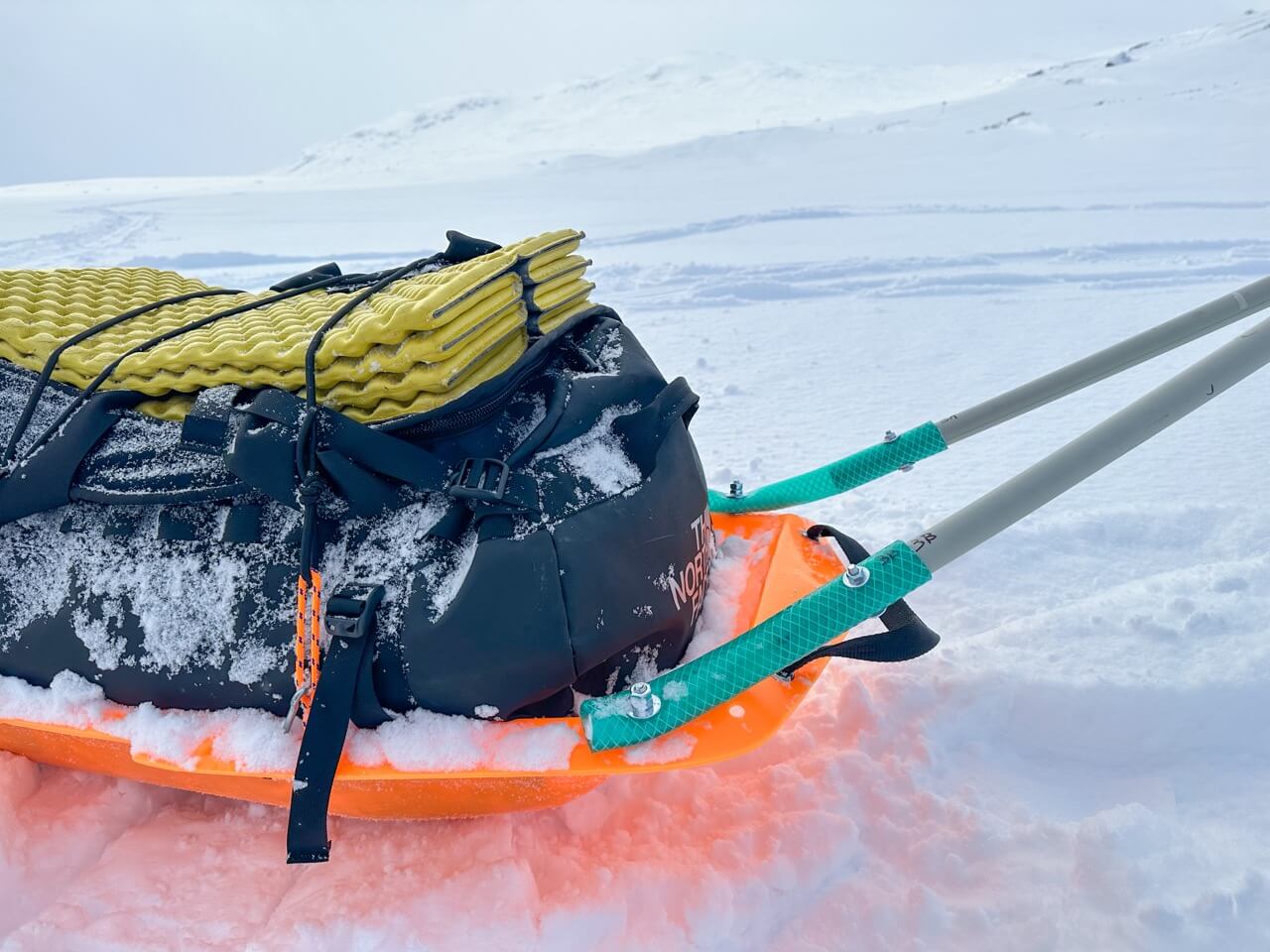 Buď můžeš využít originální saně s celým tažným systémem např. od značky Fjallpulken nebo si saně sestav sám. Postroj jednoduše vytvoříš z odnímatelného bederního pásu z turistického batohu, na který připevníš karabiny nebo si můžeš pořídit originální postroj. Více o tom, jak si sestavit polární saně „pulky“, najdeš v tomto článku.