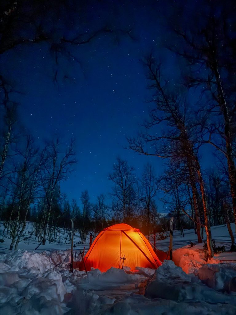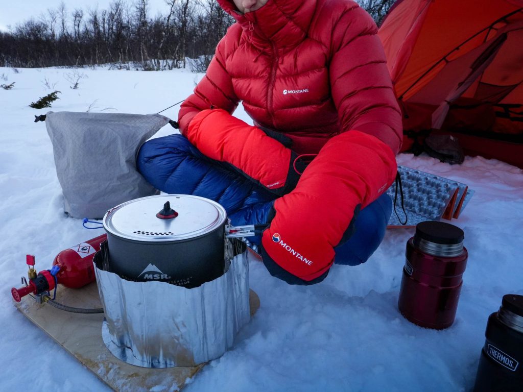 na Kungsledenu jsme měli dvouplášťový expediční stan se samonosnou konstrukcí a odolnými pruty, které unesou i větší množství čerstvého sněhu a severský vítr; za příznivých podmínek se to dá zvládnout i s dobrým třísezónním stanem – například kamarád Filip Raboch na polární výpravu do Finska vyrazil s ultralehkým stanem Big Agnes Tiger Wall UL2, Pavlína Adam s Kubou Jonášem používali MSR Hubba Hubba NX